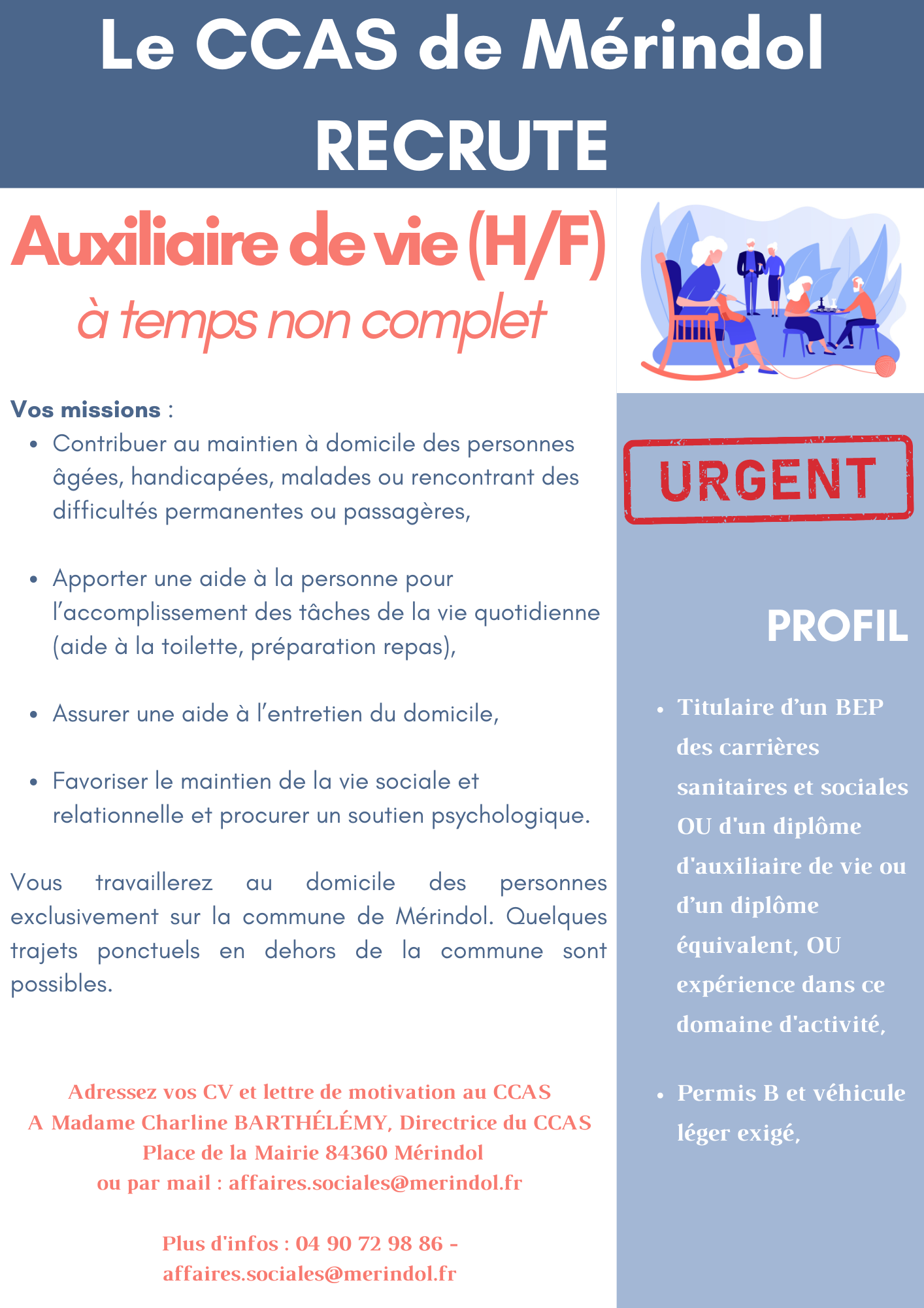 Le CCAS de Mérindol recrute un ou une auxiliaire de vie pour un contrat de 6 mois renouvelable. Prise de poste immédiate.