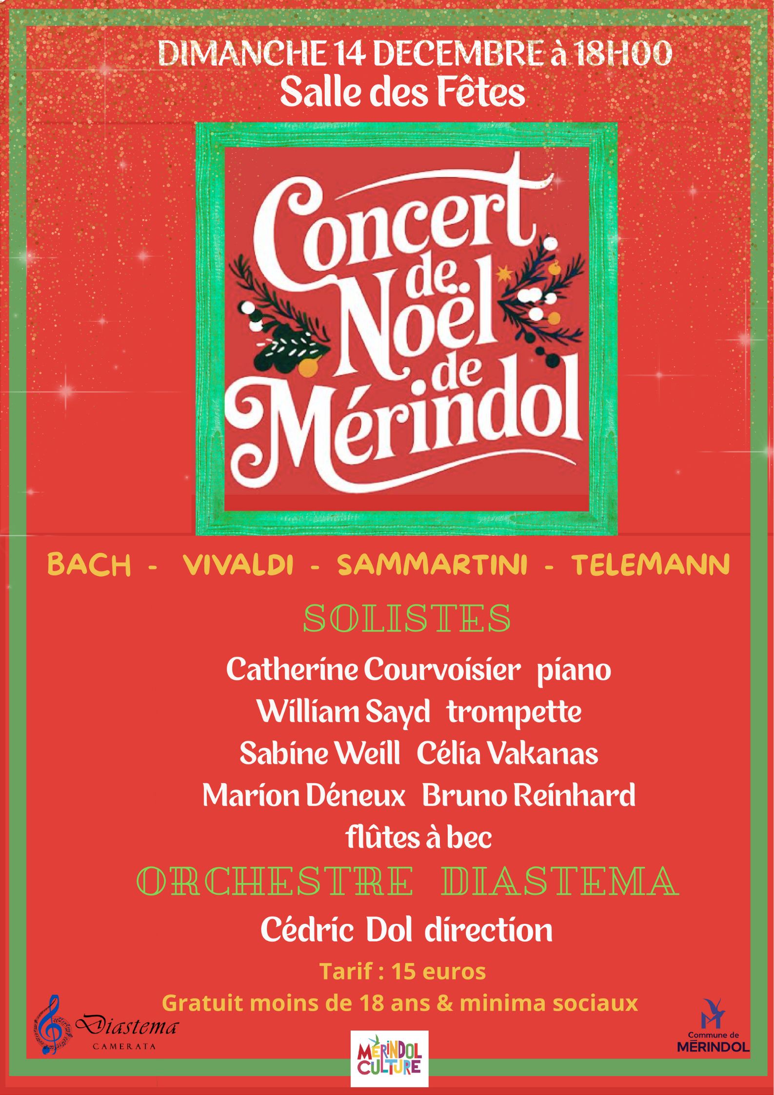 Venez célébrer la magie de Noël lors d'un concert exceptionnel à la Salle des Fêtes de Mérindol. L'Orchestre Diastema, sous la direction de Cédric Dol, vous propose un programme festif mêlant les plus belles pages de Bach, Vivaldi, Sammartini et Telemann.