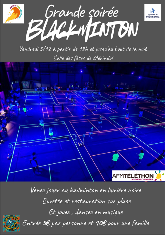 18h : Grande soirée BLACKMINTON (badminton en lumière noire) jusqu'au bout de la nuit à la salle des fêtes