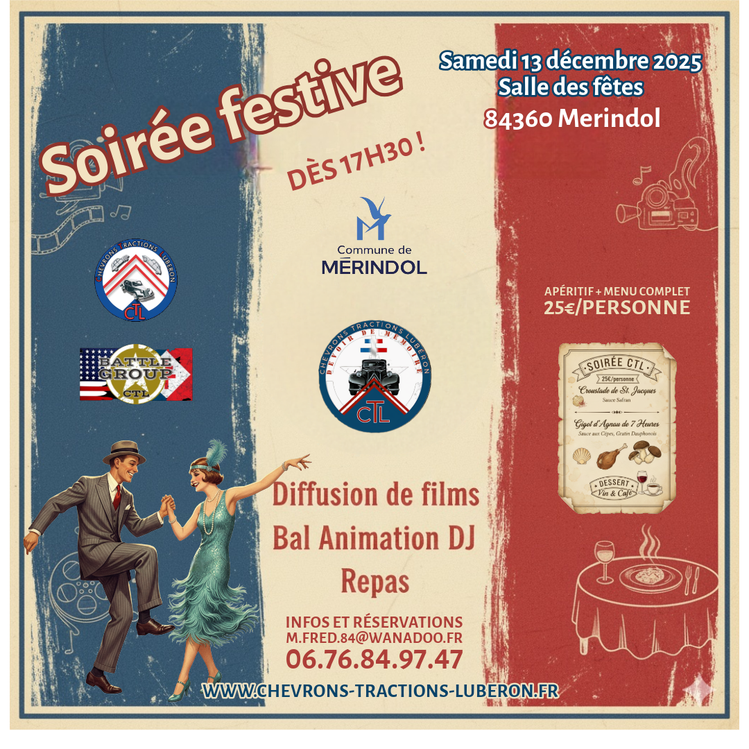 Rejoignez l'association Chevrons Tractions Luberon pour une soirée inoubliable à la Salle des fêtes de Merindol !