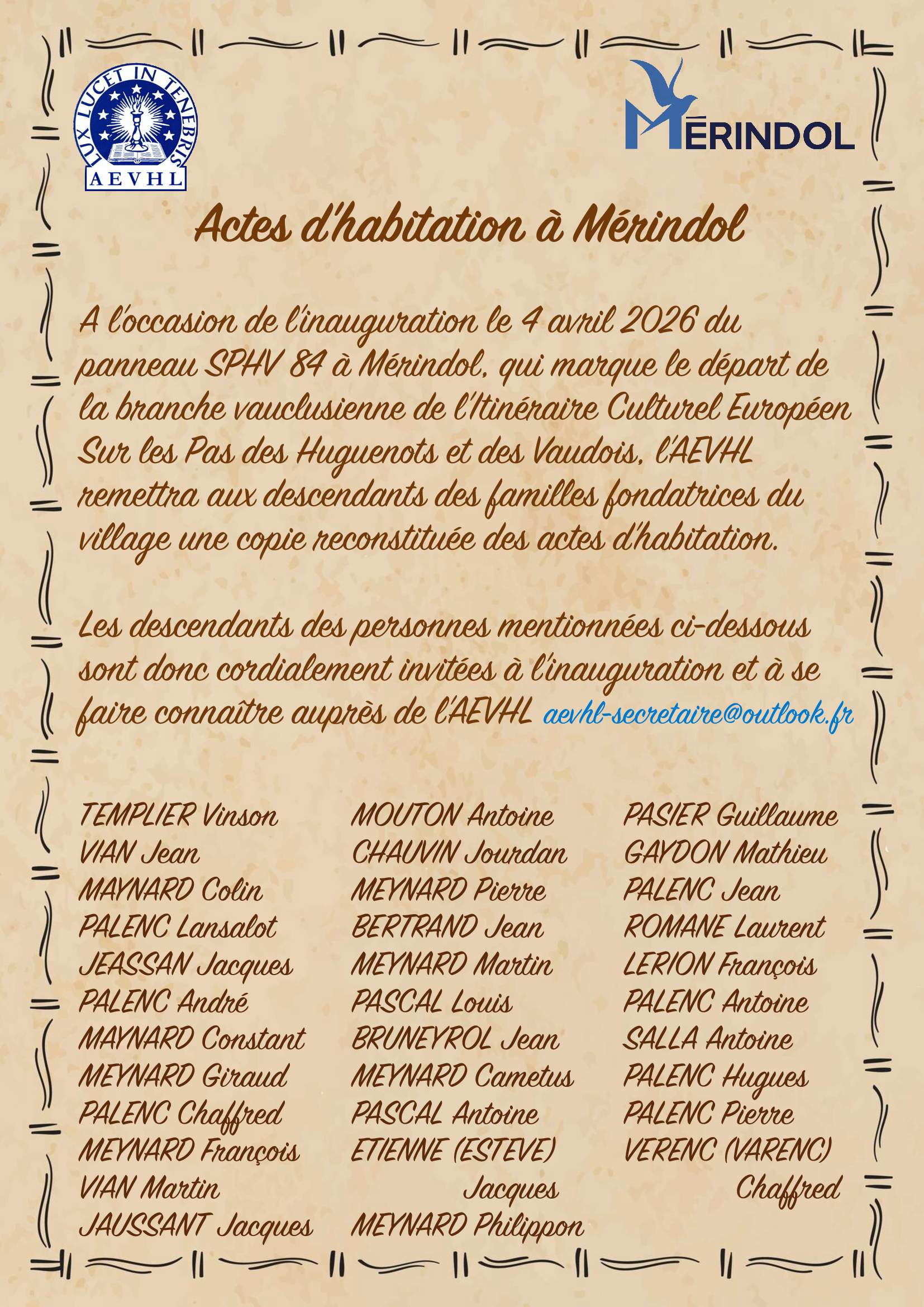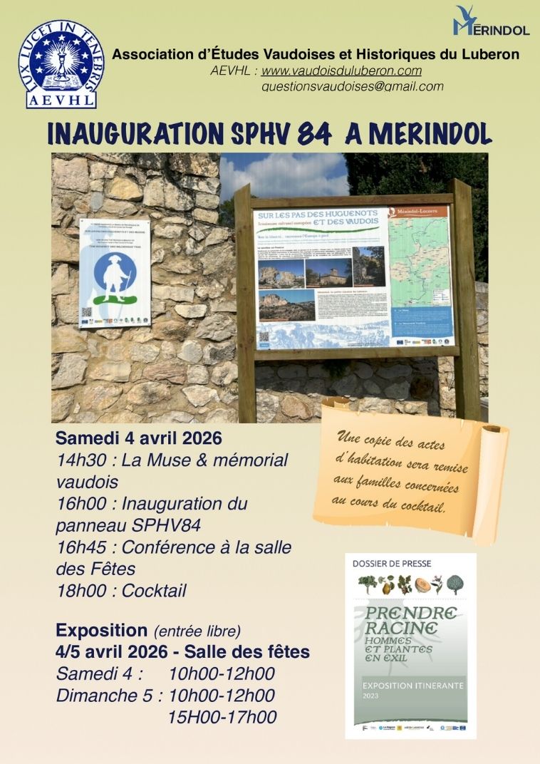 L'Association d'Études Vaudoises et Historiques du Luberon (AEVHL) vous convie à un événement historique et mémoriel à Mérindol, marquant le départ de la branche vauclusienne de l'Itinéraire Culturel Européen "Sur les Pas des Huguenots et des Vaudois" !